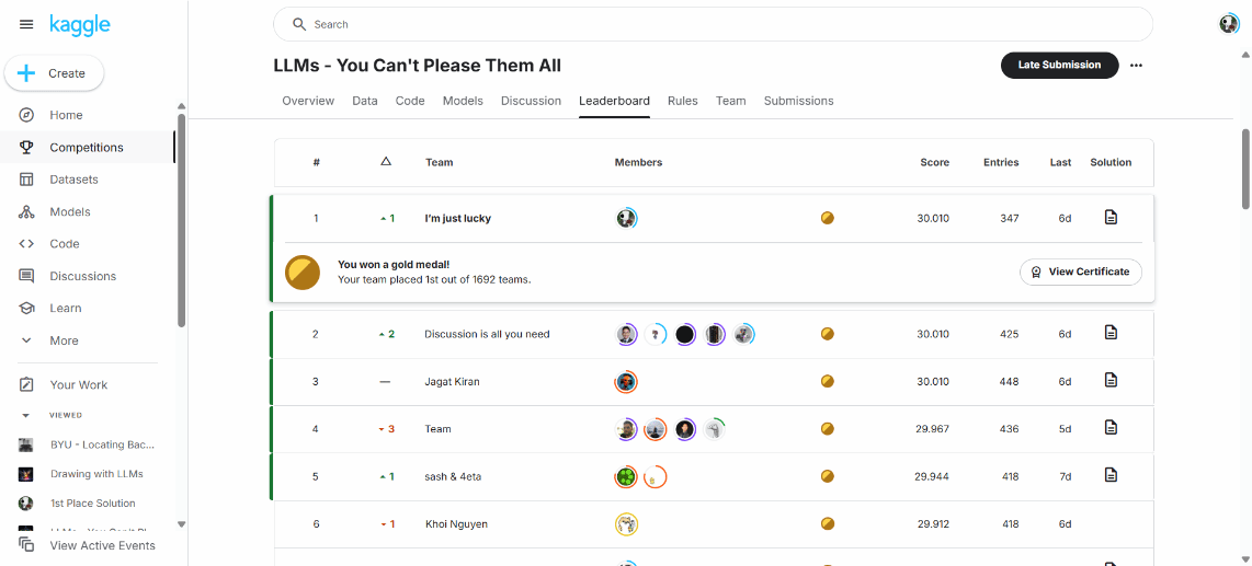此竞赛吸引了来自全球各地的数据科学家、机器学习工程师以及相关领域的专家和学生共计超过1700支队伍参与。参赛者们面临着一系列复杂的挑战,要求他们设计并实现能够有效处理和理解自然语言的模型,同时解决实际应用中的各种问题。