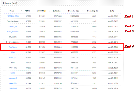 在历经三个多月的激烈角逐后,yl6809永利官网何刚老师(https://web.xidian.edu.cn/ghe/)带领团队WestWorld在视频压缩赛道(P-frame track)中获得了全球第四,高校排名第二的优异成绩。何刚老师是yl6809永利官网图像传输与处理研究所(图像所)骨干成员,图像所隶属于ISN国家重点实验室,负责人为李云松教授。下图为各队伍成绩排名情况(队伍名蓝色为认定有效参赛队及有效参赛成绩)。http://challenge.compression.cc/leaderboard/pframe/test/