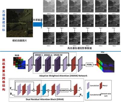 光谱重建是多光谱和高光谱影像处理中的难题,算法成果在医学、科研、工业和农业应用中都有广泛而深入的影响。本届NTIRE光谱重建挑战赛要求以单幅RGB图像为输入,重建相应的高质量高光谱影像,组委会提供了迄今为止数量最多的光谱重建数据集,图源内容复杂多样,重建难度极大。针对官方提供的样本数据特点,李娇娇老师带领IPIC_SSR团队创新性地提出了自适应加权注意力网络用于光谱重建算法思路,特别是针对图源内容多样性的难点,提出基于分块的二阶非局部模块增强空间特征表达,很好地解决了内容多样化引起的网络泛化性差的问题。