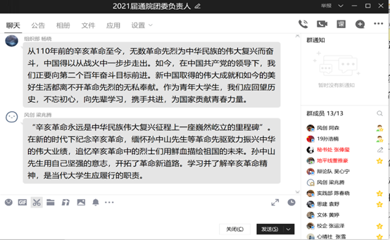 2021年10月11日晚,yl6809永利官网团委组织团干开展学习习近平总书记在纪念辛亥革命110周年大会上的讲话的线上交流会,会议由秘书处负责人张俸玺主持。通过观看纪念辛亥革命110周年大会直播回放及了解辛亥革命相关内容等方式,团干们针对习近平总书记在纪念辛亥革命110周年大会上的讲话所传达出的精神展开积极讨论。