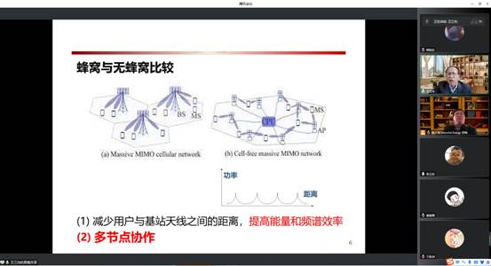 王院士首先介绍了蜂窝网络的概念以及为什么要发展无蜂窝移动通信,基于目前蜂窝移动通信存在的基站之间不协作的问题,对传统的蜂窝网络和无蜂窝网络进行了比较,发现无蜂窝网络能够很好的减少用户与基站天线之间的距离,提高能量和频谱效率,并且能够实现多点协作。
