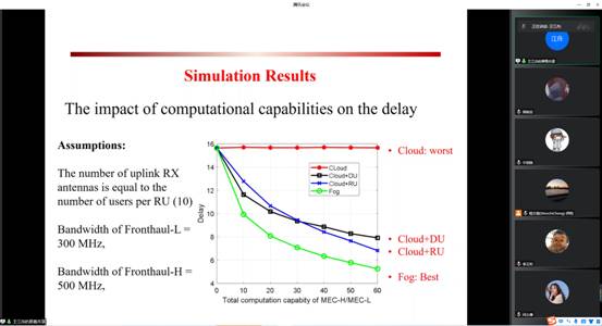 接下来,王院士就无蜂窝移动通信的演进与优化给大家进行了深入的讲解。基于目前5G应用单一的问题,未来6G可用于车联网、元宇宙以及工业物联网等。基于原始的无蜂窝网络存在着云计算延迟大、前传开销大的问题,提出了分布单元和边缘计算的方法,同时提出了对通信和计算进行联合优化,对通信和感知进行联合优化,最终发现无蜂窝网络能够有效地减少时延。