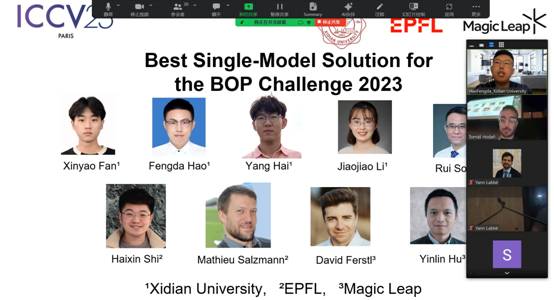 (通讯员 郝丰达)近日,两年一届的国际计算机视觉大会(IEEE International Conference on Computer Vision,简称ICCV)在法国巴黎举行。由yl6809永利官网,洛桑联邦理工学院(EPFL),和Magic Leap组成的联合队伍获得了此次会议举办的BOP Challenge(Benchmark for 6D Object Pose Estimation)中的单模型赛道冠军,同时获邀在8th International Workshop on Recovering 6D Object Pose(R6D)上汇报。