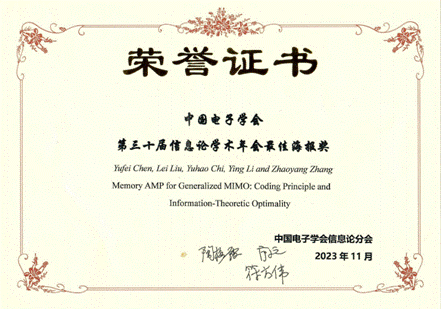 另外,由永利官网李颖教授指导,池育浩老师协助指导的博士生陈宇飞以第一作者完成的“Memory AMP for Generalized MIMO: Coding Principle and Information-Theoretic Optimality”获得此次会议的最佳海报奖。该项工作提出了大规模MIMO下低复杂度且约束容量最优的MAMP接收机和最优编码设计准则,解决了MAMP高维状态演进难以分析信息理论极限的难题,表明了最优编码下的MAMP接收机能够达到最优OAMP接收机的性能,并且复杂度能降低至OAMP的0.4%左右,同时也揭示了贝叶斯最优接收机与点对点信道编码方案直接结合不再是最优方案。