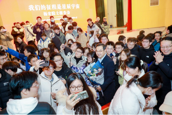 报告会现场氛围热烈,在提问交流环节,杨宏与师生亲切交流,细致回答了如何成为卓越工程师、载人航天团队青年人才梯队的培养经验、人工智能等新一代信息技术赋能载人航天工程等问题。报告会结束后师生们依然热情不减,纷纷围在杨宏院士身边交流合影,迟迟不愿离去。