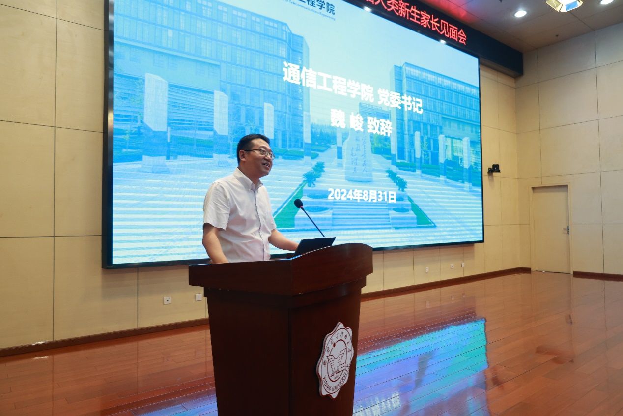 魏峻向2024级新生入学表示欢迎与祝贺,向辛勤付出的家长表示衷心感谢。魏峻围绕“如何形成家校合力共同教育好学生”与家长进行交流,希望在学院及家长的引导下帮助学生形成清晰的自我认知,通过体育锻炼锤炼意志品质,加强学生身心健康教育,使学生明确适合自己的发展路径。魏峻谈到,未来新兴科技的发展需要青年的创造与坚持,求真与笃定,希望家长们与学院密切联系,一同培育学生做“有德、有智、有为”大学生。